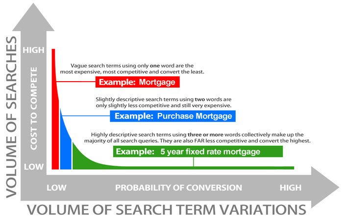 As you move further along the demand curve from simple single word keywords such as "mortgage" to a little more descriptive such as "find a mortgage' competition often reduces, and the keyword becomes more commercially valuable.